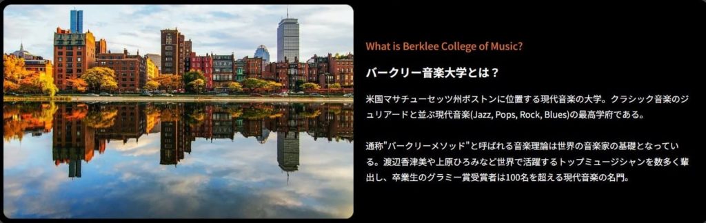伝統的な音大がクラシック音楽を主体とするのに対し、バークリーはジャズ、ロック、ポップス、映画音楽など、いま、世の中で鳴っている音楽を学ぶことに特化した、非常にユニークな教育方針を持っています。