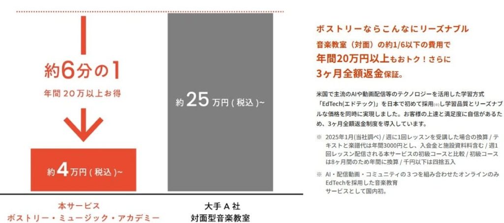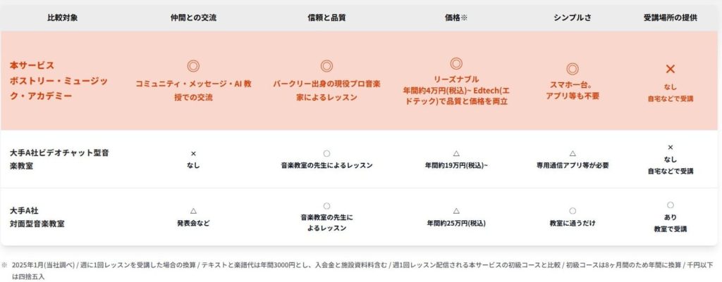 ボストリーミュージックアカデミーは、いわば「音楽教室のいいとこ取り」をしたサービスです。独学の「安さ・自由さ」と、教室の「プロによる指導」が合体しているからです。