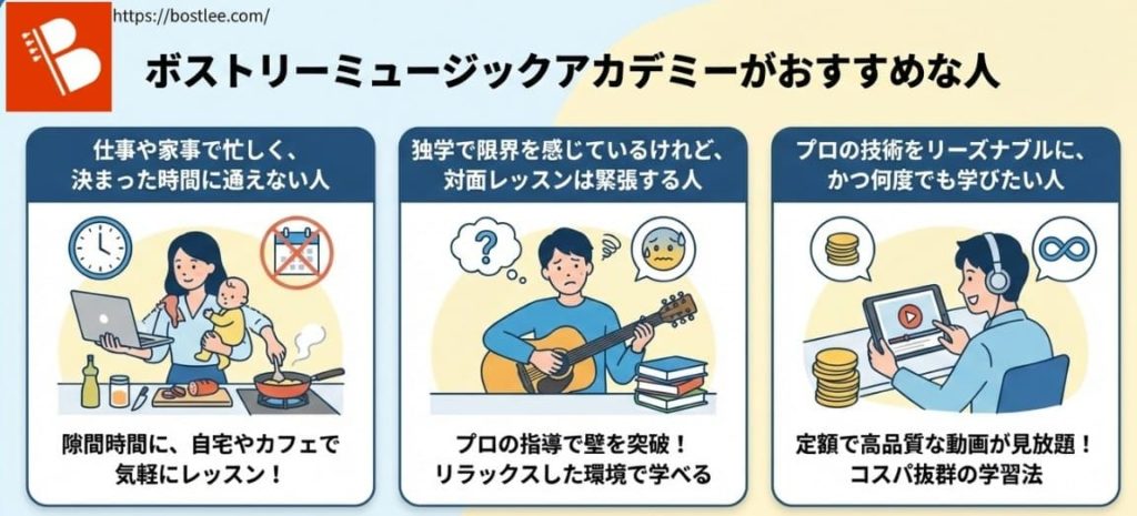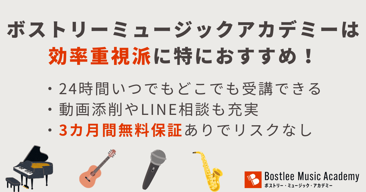 結論から言うと、ボストリーミュージックアカデミーは自分の時間を大切にしながら、最短ルートで上達したい効率派の人にぴったりです。
