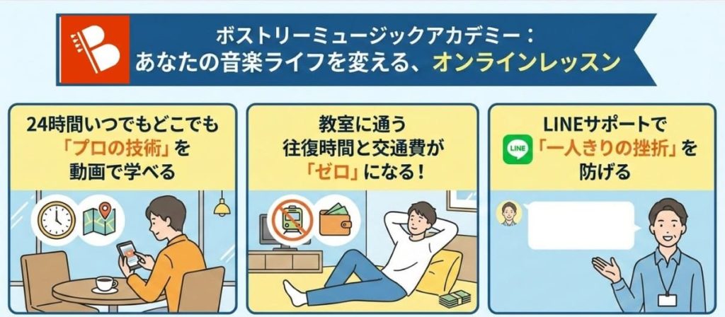 もし、あなたが「周りの目を気にせず、自宅でこっそり、でも確実に上手くなりたい」と願っているなら、ボストリーミュージックアカデミーは間違いのない選択ですよ。