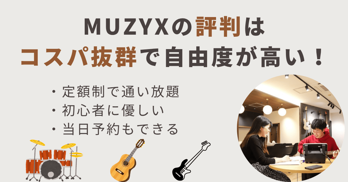 MUZYXの評判をまとめると、定額で通い放題という仕組みと、自由に予約できる通いやすさが高く評価されています。