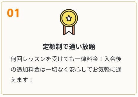 | とにかくたくさん練習して早く上達したい人 | 定額制で通い放題 | 練習量を最大化でき、成長速度が加速する |