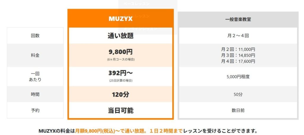 このように、MUZYXは他教室の約半額で、レッスン回数は無制限。特に通えば通うほど単価が下がる仕組みは、継続学習において大きなアドバンテージです。