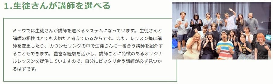 ボーカルレッスンミュウは「講師の指導力が高い」という点で、多くの利用者から信頼を集めています。