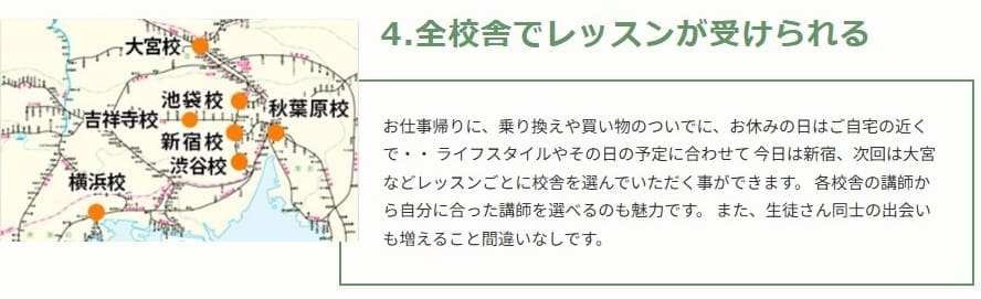 また、ボーカルレッスンミュウは校舎が都心に複数あり、複数校舎の併用が可能です。