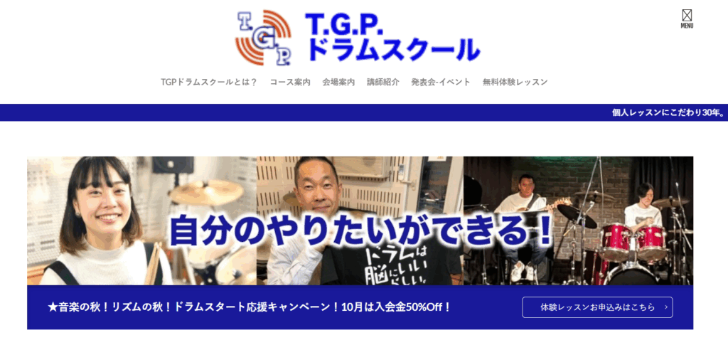 | TGPドラムスクール | 30年以上の実績・個別指導スタイル |