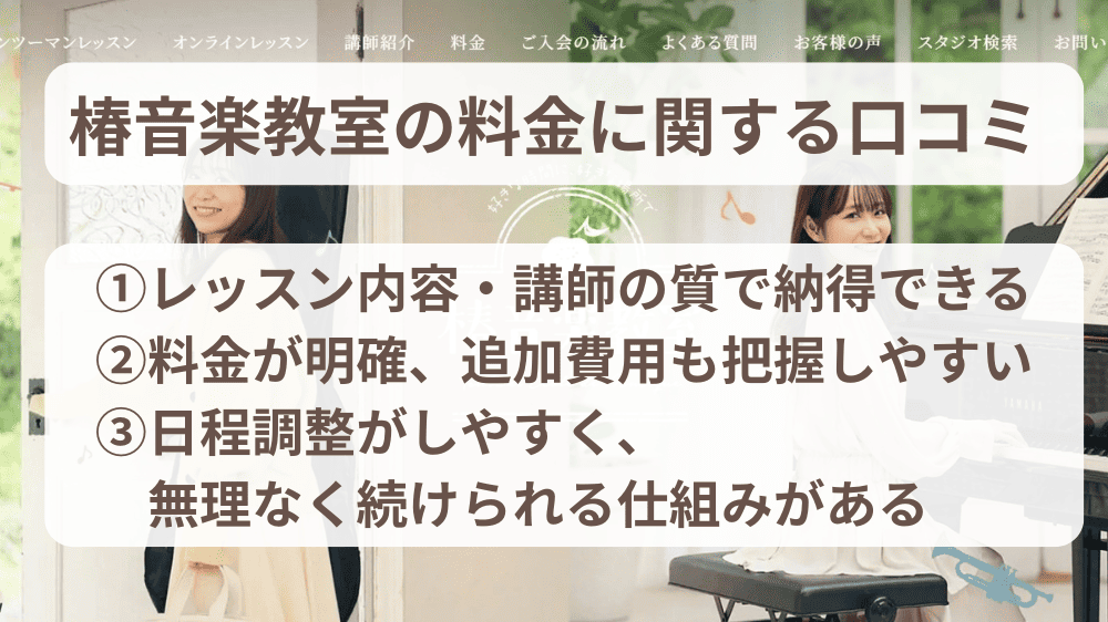 • 椿音楽教室は「料金がやや高いが内容に納得できる」という口コミが多数