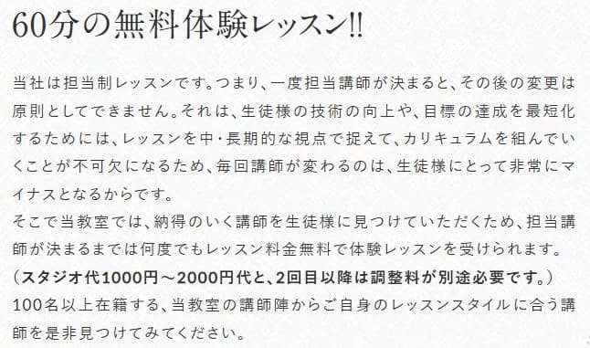 なぜなら、実際にレッスンを受けてみると、講師の質・レッスンの内容・柔軟な通い方など、数字では測れない価値を体感できるからです。